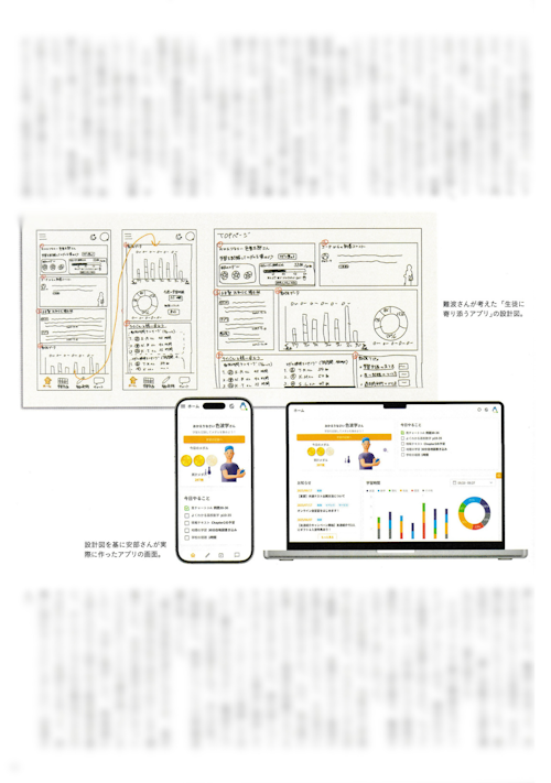 誌面では、最初に描かれた手書きのワイヤーフレームから、実際のアプリ画面へと形になっていく過程が紹介されています。生徒が1日の中で何を・どのくらい学んだのかを一目で把握できるダッシュボードや、日次チェックリストなど、