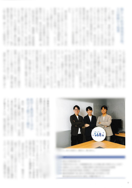 誌面では、創業メンバー3名の写真とともに、大学時代の出会いから現在に至るまでの歩みが紹介されています。